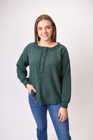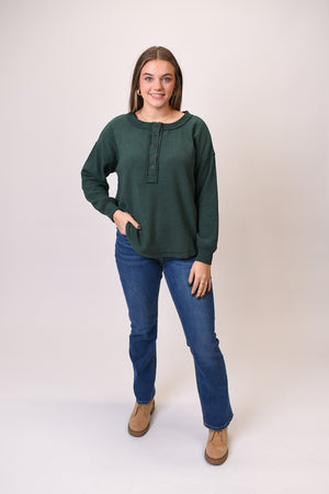 • Features: Round neckline, henley half-button front, long sleeves, exposed seam detail, ribbed knit texture