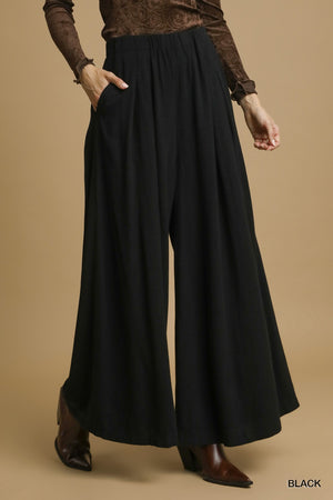 Features: Elastic waist, high waisted, wide leg, palazzo silhouette, side pockets