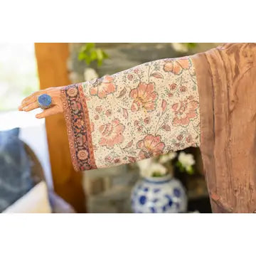 "Exotic, painterly, and chic — this piece is for the travelers and dreamers who love to collect stories wherever they roam. We brought together a beautiful mix of prints that evoke the rich texture of a tapestry. The watercolor painting with its elegant vase and dried sunflowers was done by Dutch artist Maria Vos in 1879. We mixed Vos’s work with several other art pieces, including a late 1700’s paper block-print, a Turkish carpet, and the design from a French antique Chinoiserie plate."