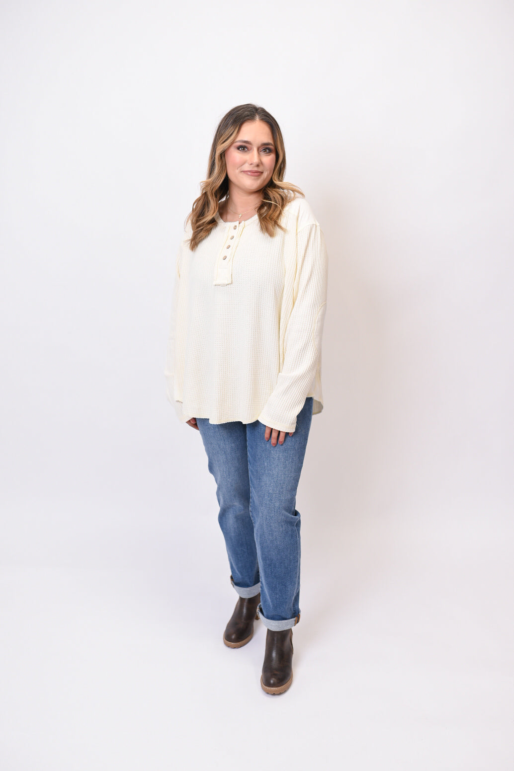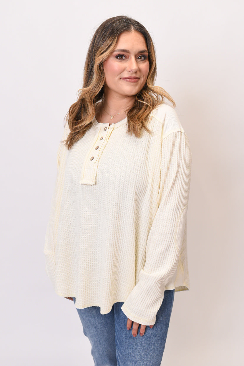 Embrace laid-back comfort with this washed thermal henley top. Featuring a relaxed waffle knit texture and oversized silhouette, this cozy essential is perfect for those days when comfort is your only plan.