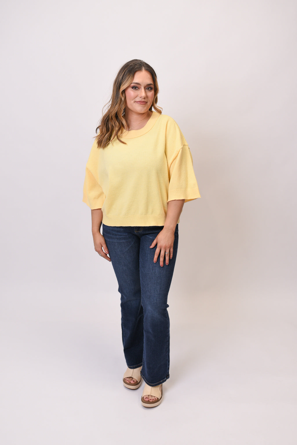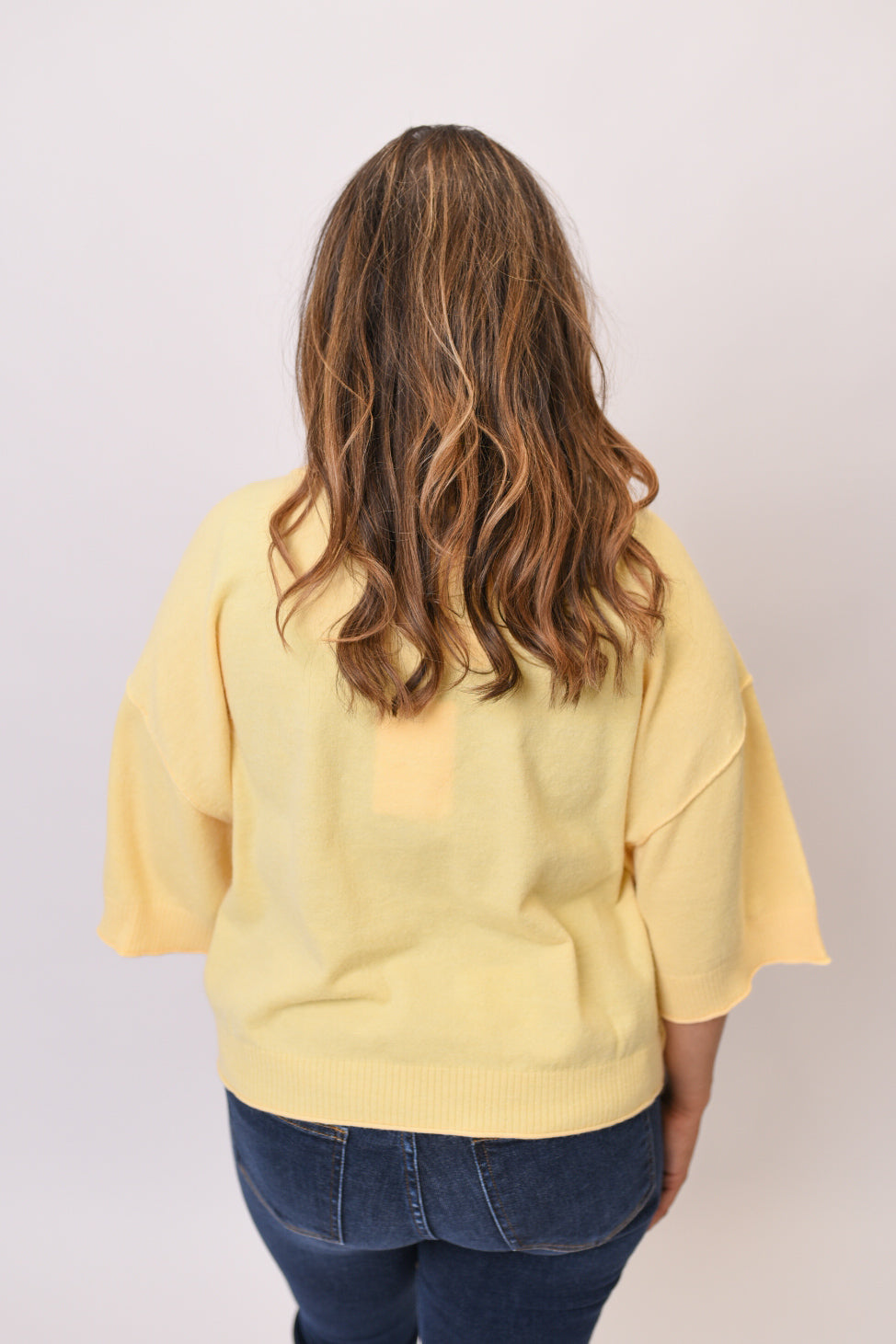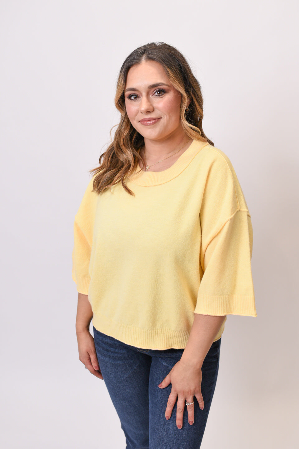 Find your Happy Place in this cozy pullover sweater. This solid knit pullover features relaxed 3/4 wide sleeves and a flattering cropped length that pairs perfectly with high-waisted bottoms. The classic round neckline and ribbed hems add timeless details to this versatile piece.