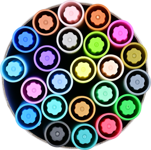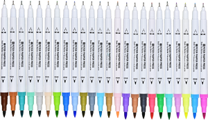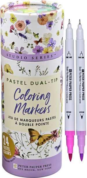 Premium pastel markers are ideal for drawing, lettering, coloring, crafting, and more! 24 beautiful pastel hues! A versatile range for a variety of art projects! Each marker has 2 tips: Fine (0.4 mm), for intricate detail work and underlining; and Brush , for broad area coverage and highlighting. Acid-free, water-based ink is fast drying and fade-resistant. Perfect pastel color selection! Soft pinks, blues, greens, yellows, and more. Dual-tip markers come in a stylish cylindrical-shaped storage tube that safeguards your set when not in use. Ideal for travel, art classes, and creativity on the go! Set is also perfectly suitable for gift-giving! Each marker measures 6-1/4'' long. Card stock storage tube measures 7-1/2'' high x 2-1/2'' in diameter. Clear acetate lid.
