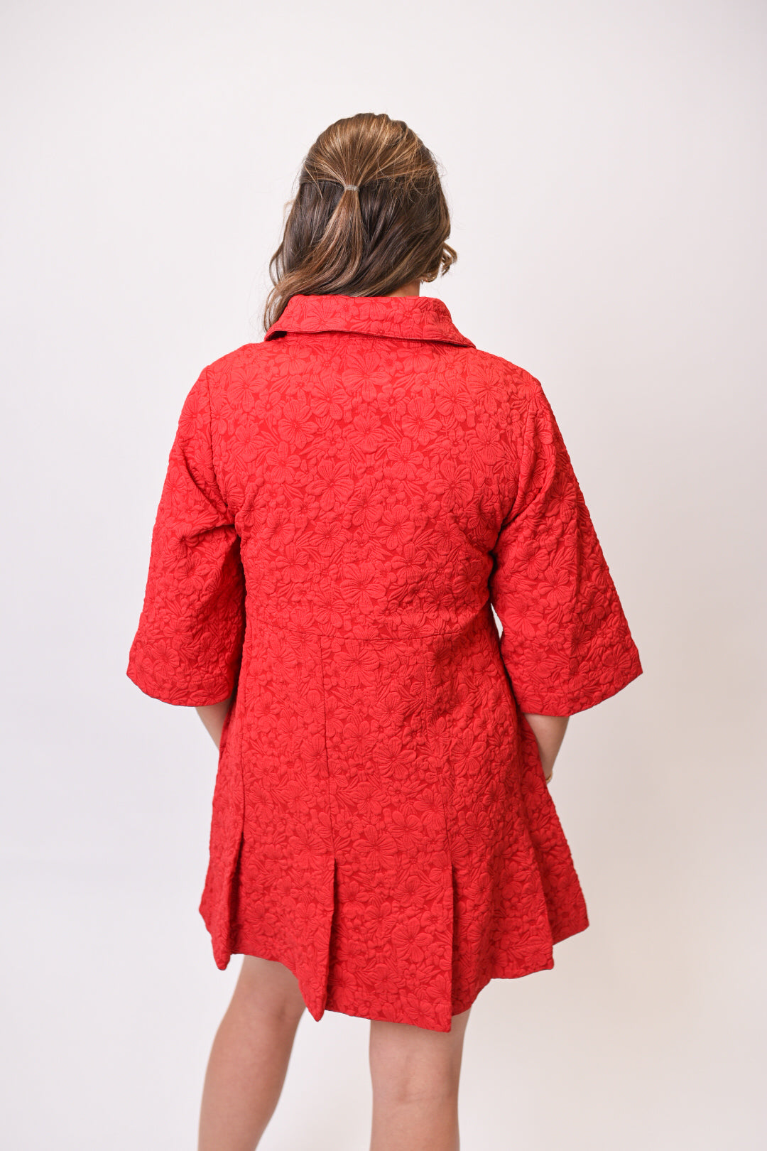 Features: Collared neckline, 3/4 wide sleeves, pleated hemline, side pockets, floral jacquard texture