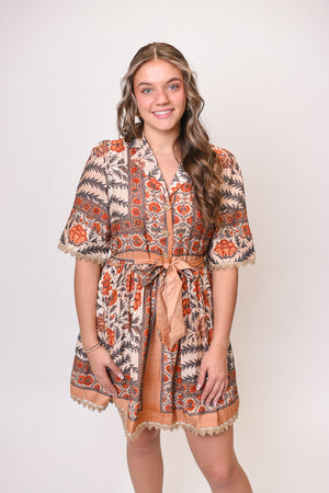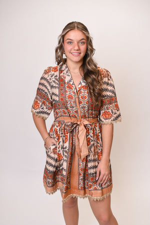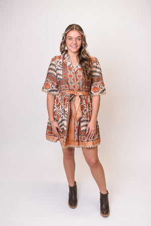 The Going To The Harvest Mini Dress captures that effortless boho charm with a touch of fall romance. Designed in a rich rust and charcoal floral print, this piece features delicate lace trim, soft puff sleeves, and a flattering belted silhouette that highlights your shape while keeping things comfortable. Lightweight and lined, it’s a must-have for seasonal gatherings, Thanksgiving dinners, and cozy nights out.