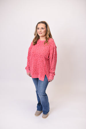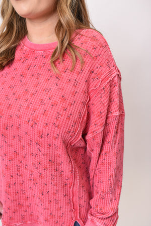 This floral thermal brings a playful poppy-red hue with a lived-in mineral wash that feels instantly cozy. The oversized fit drapes comfortably, while the ditsy floral pattern adds a sweet, casual charm. Its textured waffle knit and exposed seams give it that perfectly relaxed weekend vibe.