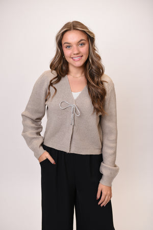 Playful with a hint of sparkle, this cozy sweater adds a flashy twist to your winter wardrobe. Designed with a deep v-neckline, button front, and rhinestone bowtie detail, it’s the perfect mix of fun and festive for nights out or holiday gatherings.