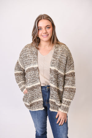 Features: Open front, striped knit, color-mixed yarn, cozy slouchy silhouette