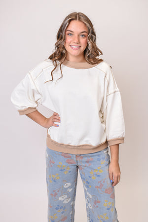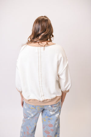 Features: Contrast rib bands, raw-edge detail, exposed stitching, dropped shoulder, ¾ sleeves, round neck