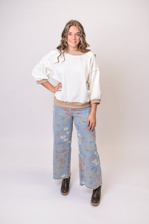 Meet the pullover that does exactly what its name promises — keeps you crazy comfy while still looking put together. With soft contrast rib bands, exposed stitching, and a raw-edge finish, the Crazy Comfy Pullover brings laid-back vibes with just enough polish to wear anywhere. The oversized fit, ¾ sleeves, and dropped shoulders make it your go-to for casual days, lounging, or travel.