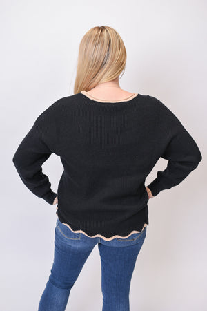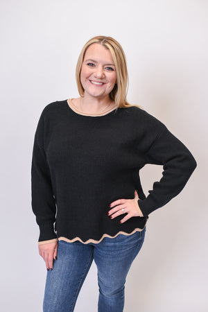 Add a touch of playful polish to your everyday looks with the Trim Twist Sweater. Crafted in a soft ribbed knit, this relaxed pullover features scalloped hemlines accented with a chic beige stripe. The drop-shoulder fit keeps it effortlessly cozy, while the feminine trim detail makes it versatile enough for both work and weekend wear.