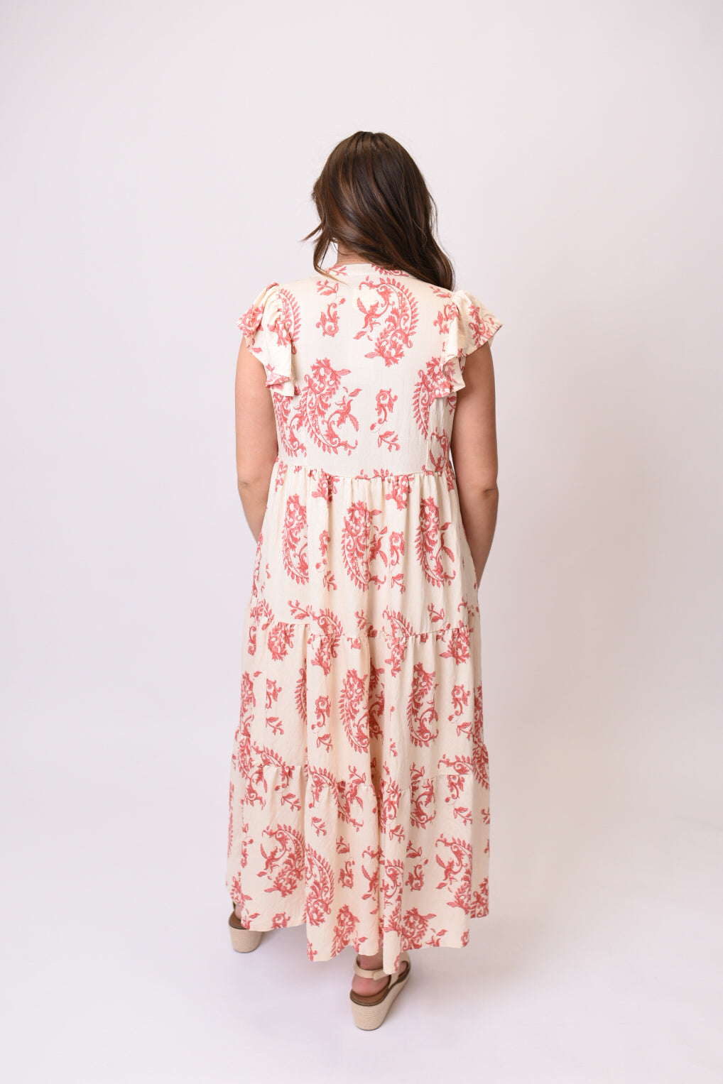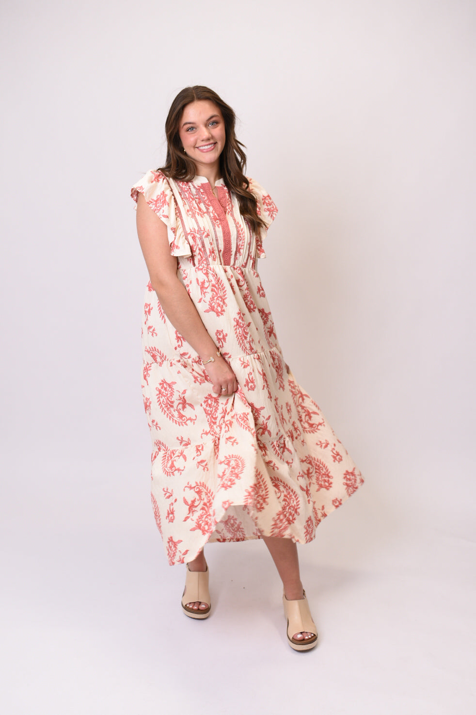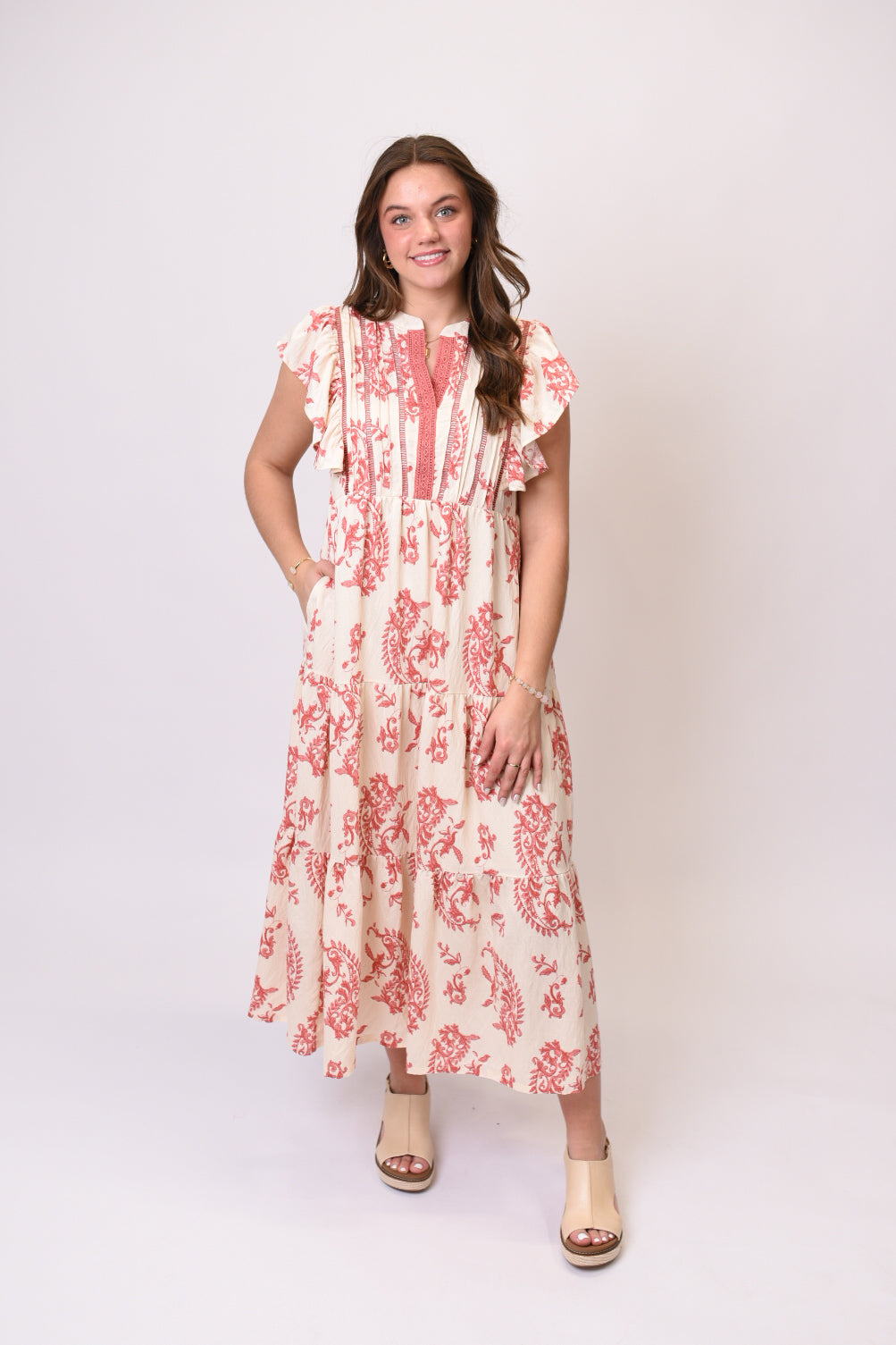 Fall in love with My Favorite Dress Midi Dress. This enchanting paisley print midi features delicate flutter sleeves and romantic lace trim detail that creates an effortlessly bohemian look. The flattering v-neckline and flowing tiered silhouette make this dress a go-to for any occasion.