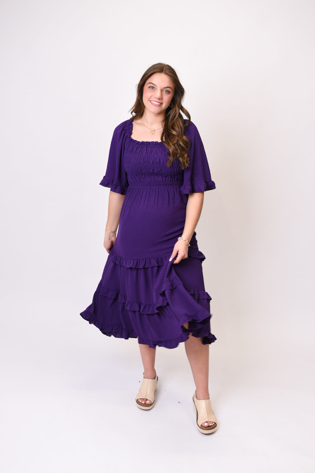 Radiate confidence and charm in the Sunshine Social Midi Dress. This stunning purple beauty features a flattering square neckline, romantic bell sleeves, and a flowing tiered skirt that's perfect for garden parties, weddings, or any occasion where you want to make a memorable entrance.