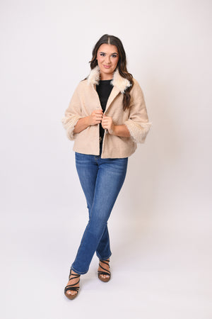 Luxe Textures: Teddy-style boucle fabric pairs beautifully with soft faux-fur trim for a rich, winter-ready look.