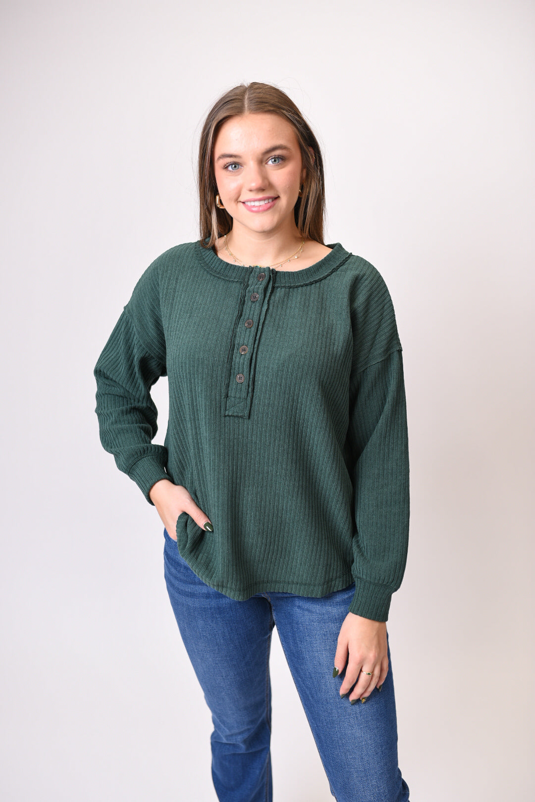 Features: Round neckline, henley half-button front, long sleeves, exposed seam detail, ribbed knit texture