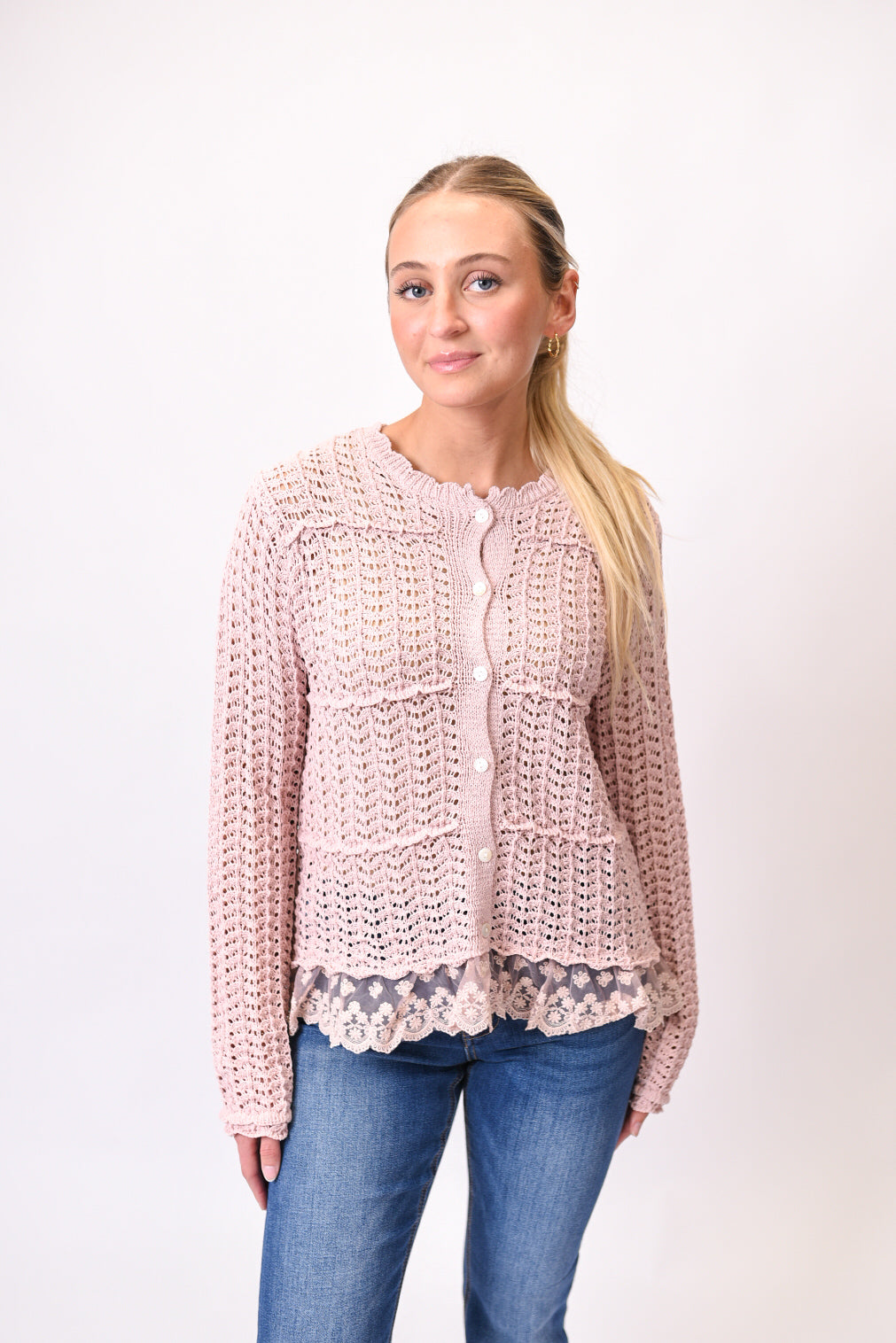 Add a layer of effortless sophistication to any outfit with this beautifully crafted cardigan in a soft, romantic pink hue. Designed with feminine details and a relaxed silhouette, this versatile piece is your go-to for transitional weather and year-round layering.