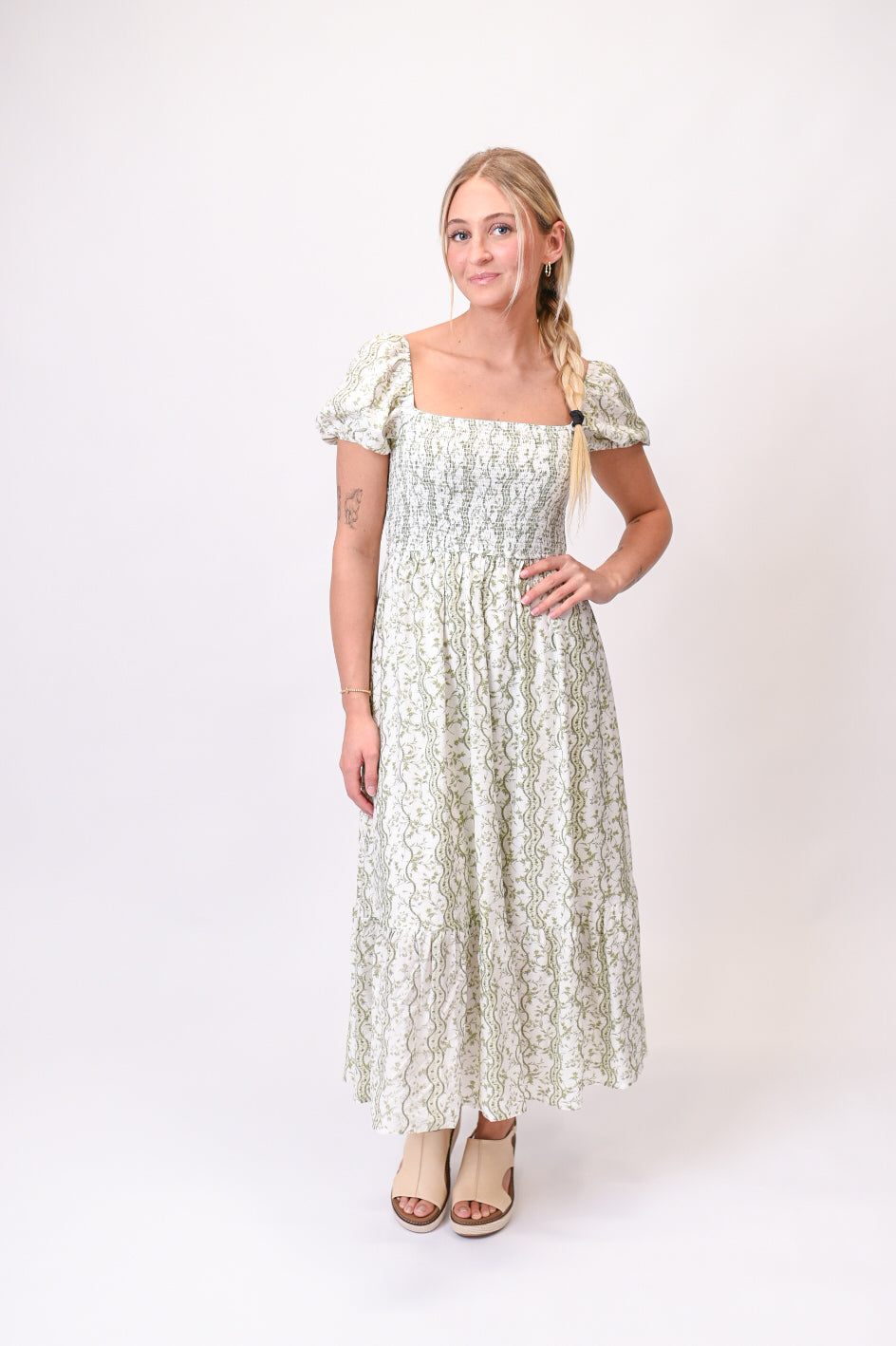 Wander through sun-dappled gardens in this romantic midi dress featuring a smocked bodice, delicate puff sleeves, and a flowing wavy floral print. The soft rayon-nylon blend drapes beautifully while the fitted bodice and ruffle hem create a dreamy, feminine silhouette perfect for warm days and special occasions.