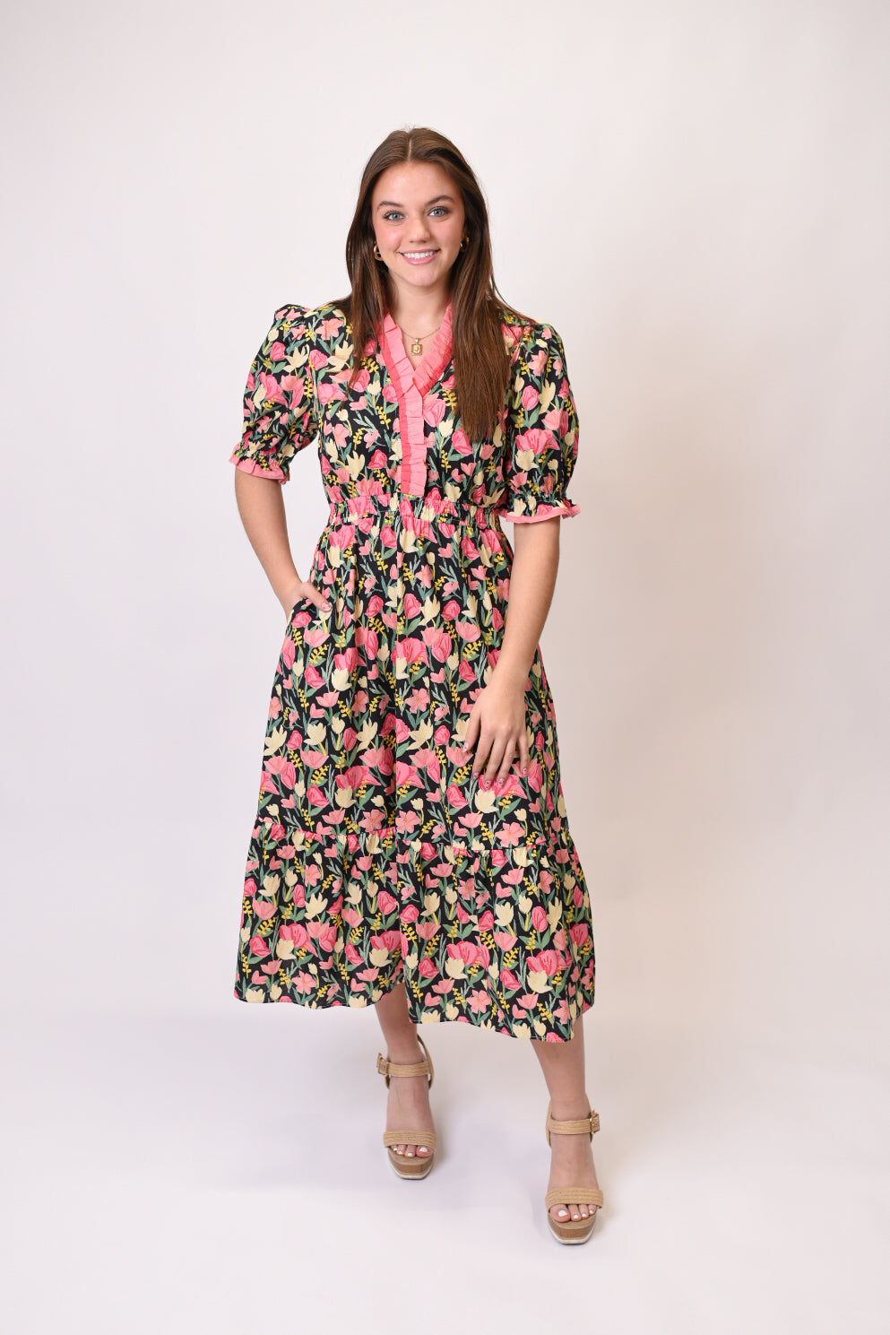 Embrace garden-fresh elegance with the Garden Vows Floral Midi Dress—a beautifully detailed A-line midi that brings romantic charm and comfortable style together. This stunning floral piece features: