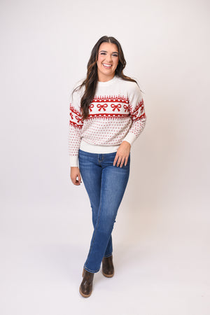 Bring on the cheer with this playful sweater featuring sweet red bows and hearts. Soft and cozy with a festive touch, it’s just the thing for holiday gatherings or a casual workday with spirit.