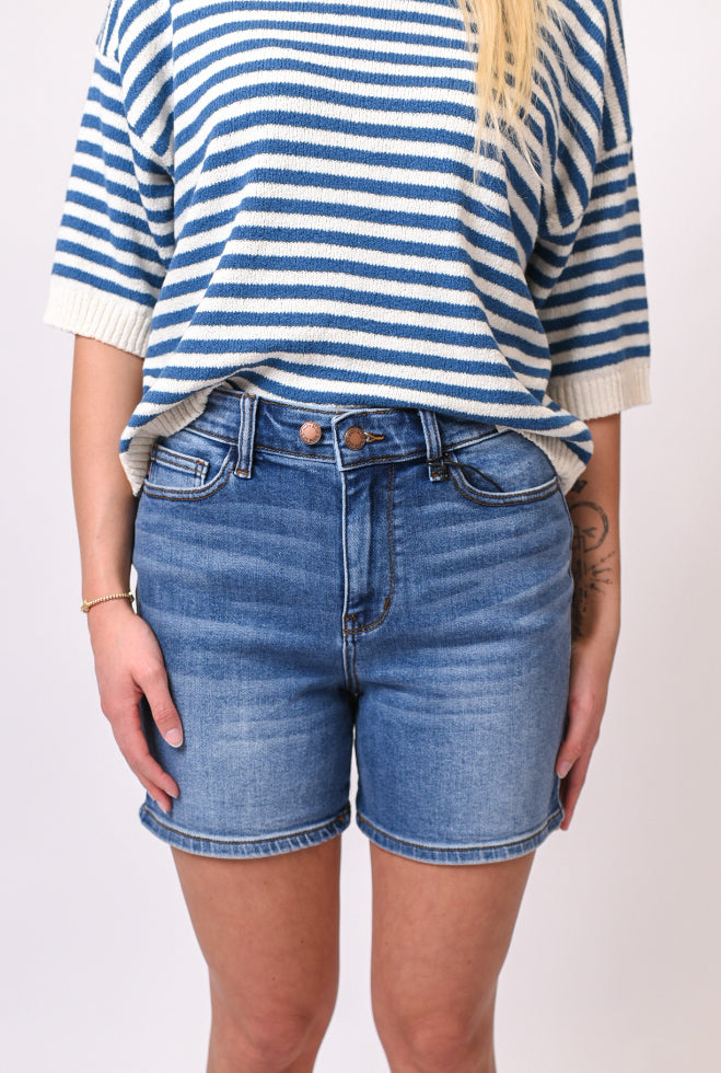 The Retro Fit Judy Blue Shorts bring classic denim style to your warm-weather wardrobe. Crafted from a cotton-polyester-spandex blend with a medium wash finish, these high-waisted shorts feature a double button detail, fit length, front and back pockets, and belt loops for a timeless, flattering look.