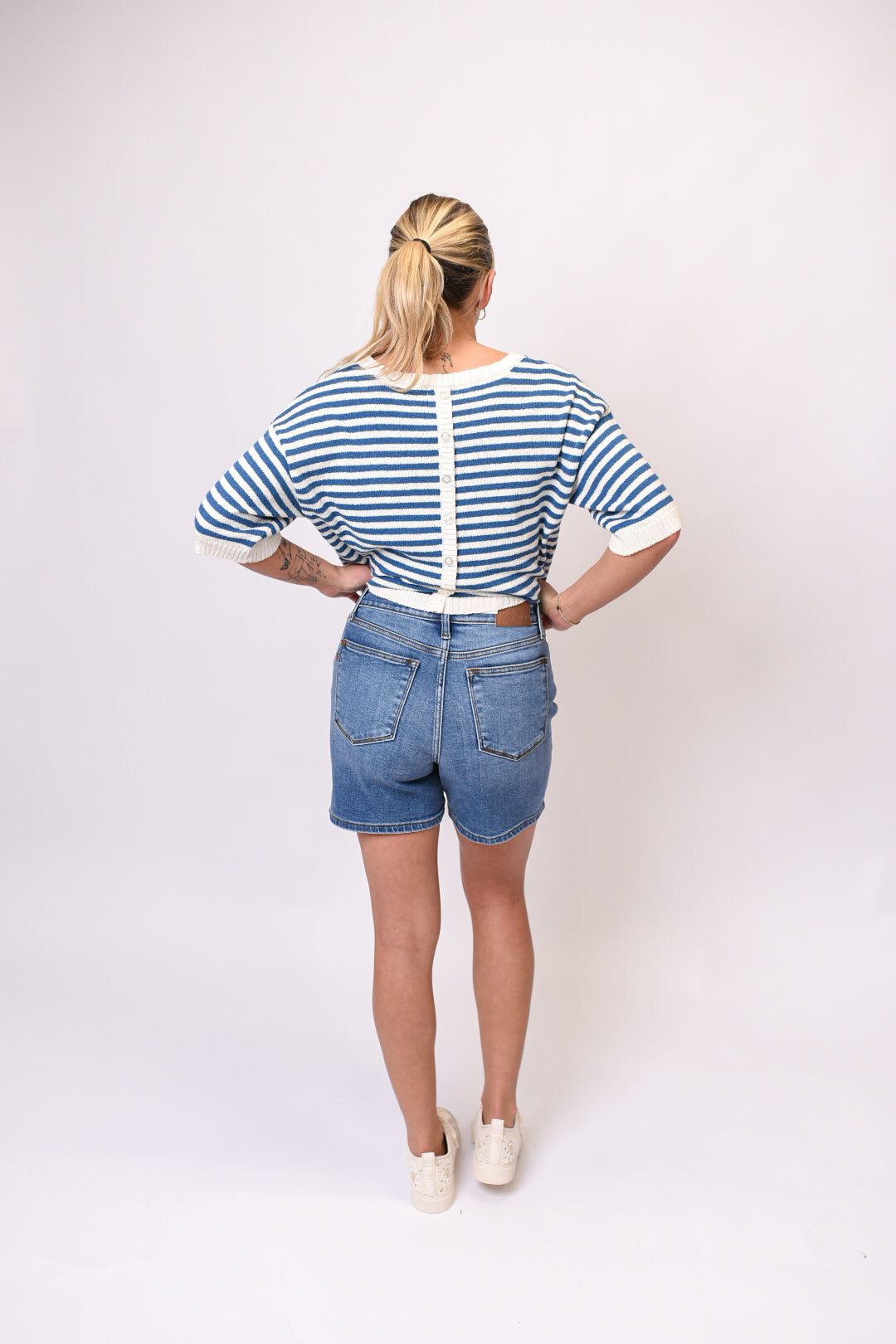Style these versatile denim shorts with a tucked-in tee and sneakers for casual weekends, or pair them with a blouse and sandals for a polished summer look. The high-waisted fit and medium wash make them a timeless staple for warm-weather styling.