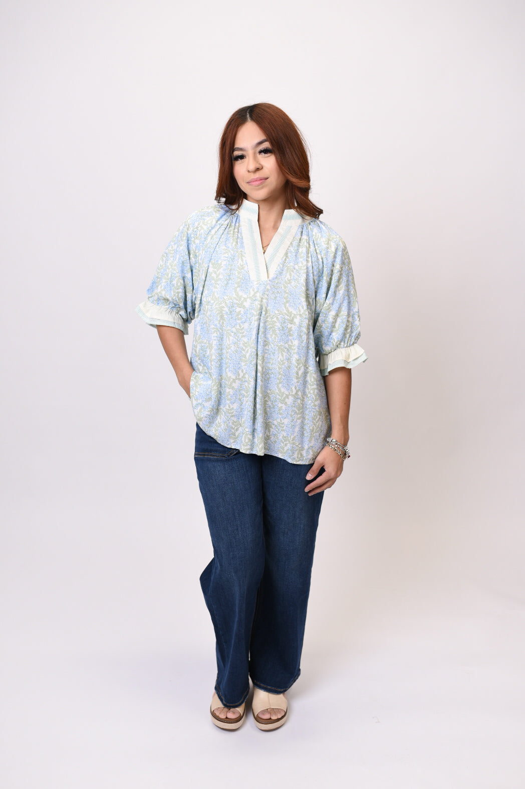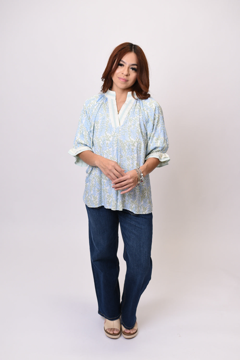 Welcome the season in style with the Spring Bliss Blouse. This vibrant spring print top features a flattering v-neckline, charming puff sleeves adorned with playful striped ruffle detail, and lightweight rayon fabric that drapes beautifully for all-day comfort.