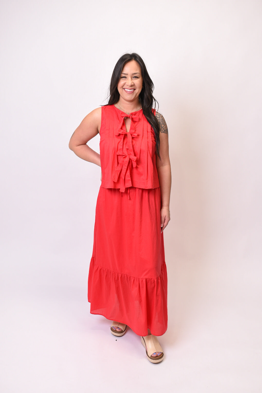 Get ready for effortless summer style with this charming tie front tank. Featuring a playful bowtie detail and elegant pleated accents, this sleeveless top is the perfect blend of feminine and fun.