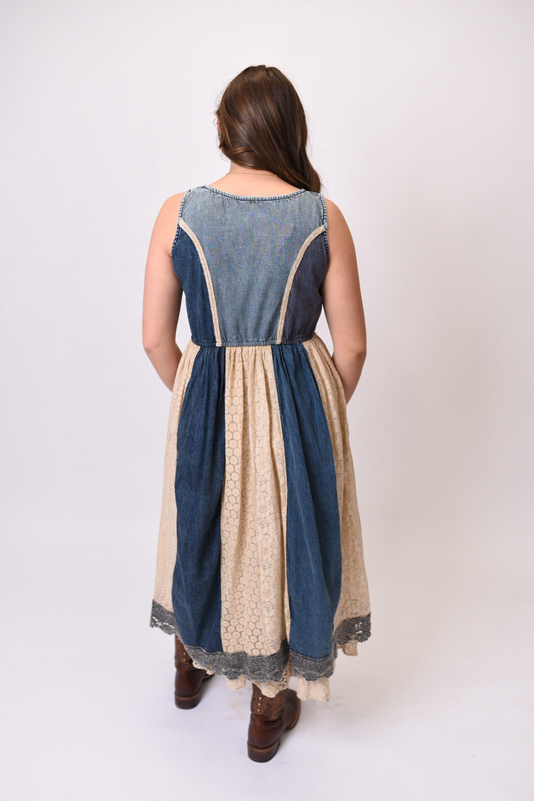 The Sunset Trail Midi Dress is where rustic denim charm meets delicate lace romance. This sleeveless beauty features a flattering U-neckline and an elastic waist that cinches perfectly, while intricate lace details dance across the soft cotton fabric. The fully lined skirt flows to a graceful midi length, making every step feel like a walk through a desert sunset.