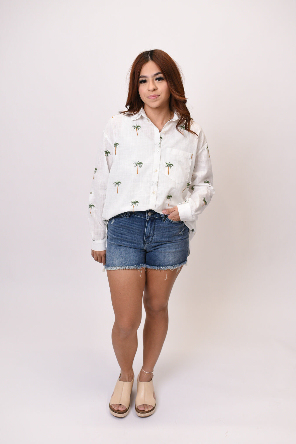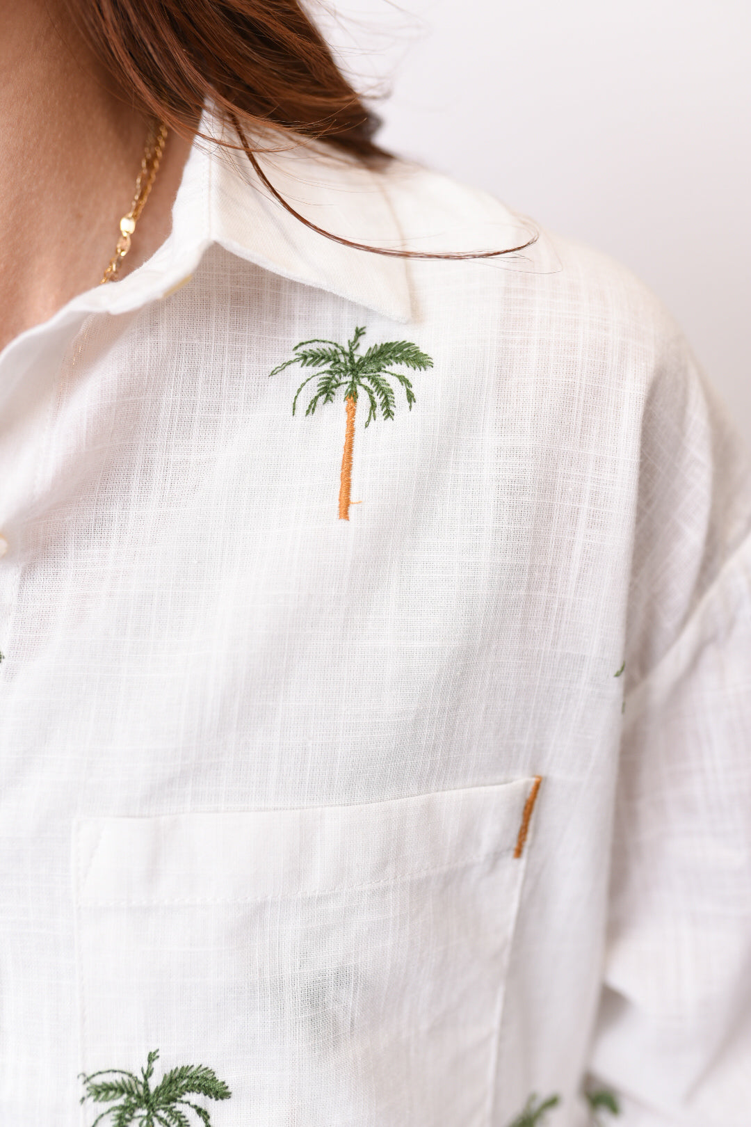 Tropical vibes meet classic style in the Under The Palms Blouse. This charming piece features delicate embroidered palm tree details that bring a touch of vacation-ready style to your everyday wardrobe. The relaxed button-front silhouette and soft cotton-poly blend make this blouse perfect for everything from casual Fridays to weekend getaways.