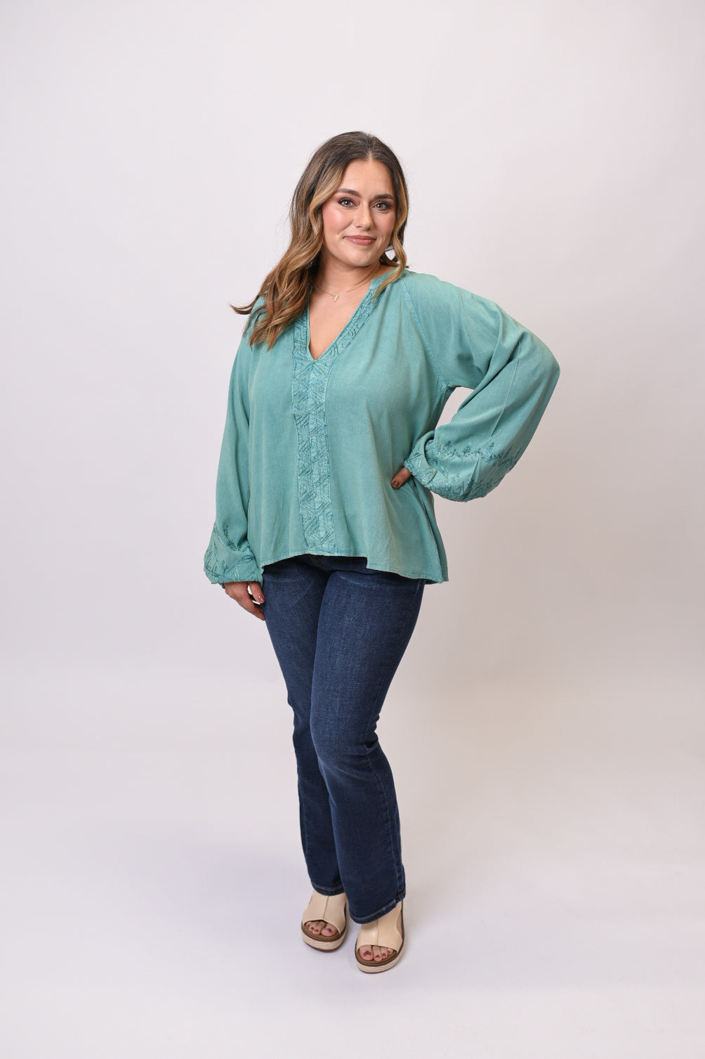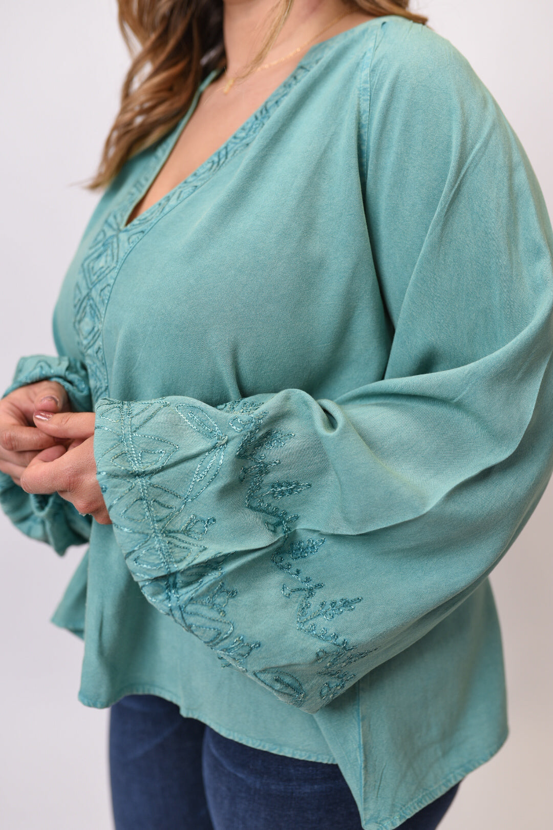 The Wildflower Whisper Blouse brings artisan charm to your everyday wardrobe. This stunning teal blouse features intricate embroidered details that add a touch of handcrafted elegance to the soft, mineral-washed fabric. The relaxed, flowy silhouette drapes beautifully for a flattering fit that moves with you throughout your day.