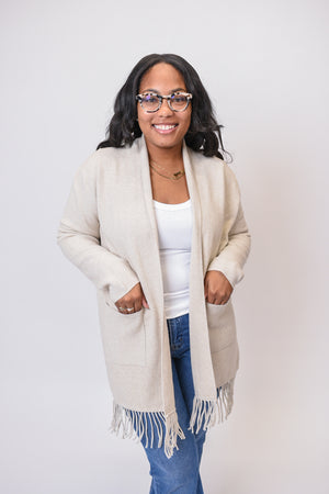 The ultimate layering piece for cool mornings and coffee runs alike. This luxuriously soft cardigan wraps you in warmth without the weight, while the fringe hem adds a playful boho twist. With its open front, long sleeves, and pockets for your essentials, it’s the cozy-chic layer you’ll reach for all season long.