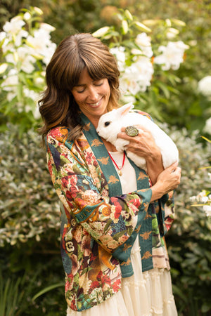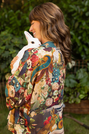 Celebrate life’s true riches with the Stay Gold Kimono—a wearable work of art blending vintage charm with heartfelt meaning. Featuring bunnies, florals, golden bees, and banners reading “stay gold” and “love is the only gold,” this flowing piece is vibrant, joyful, and endlessly versatile.