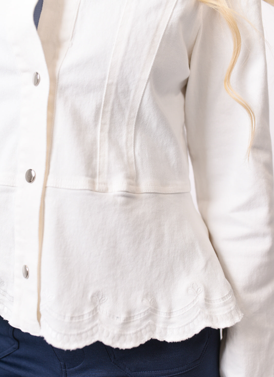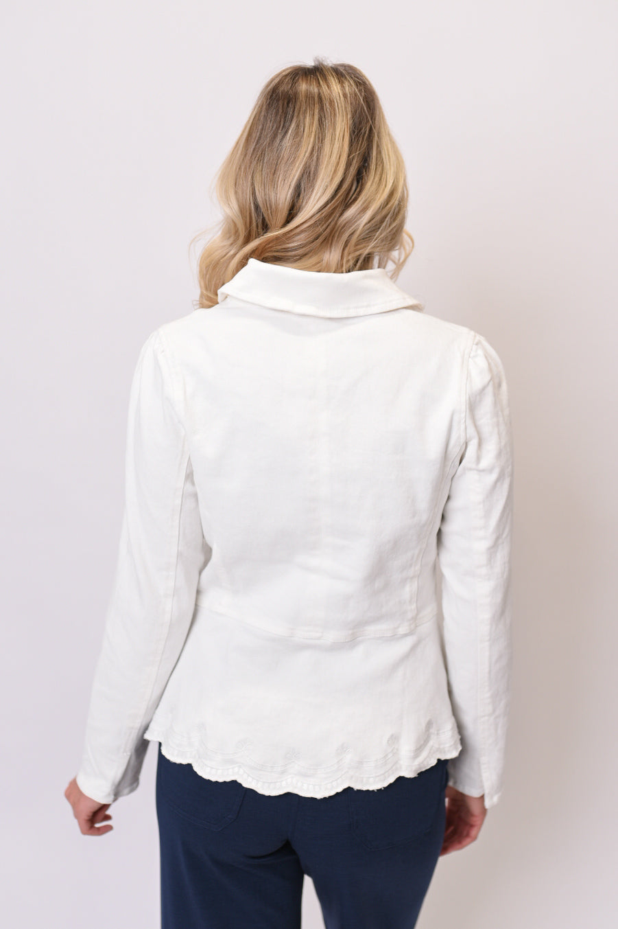 Imagine yourself on a leisurely Sunday stroll through town or enjoying brunch with friends—this jacket brings effortless polish to any casual occasion. The intricate embroidery and scalloped hem create a unique statement piece that's both practical and beautiful.