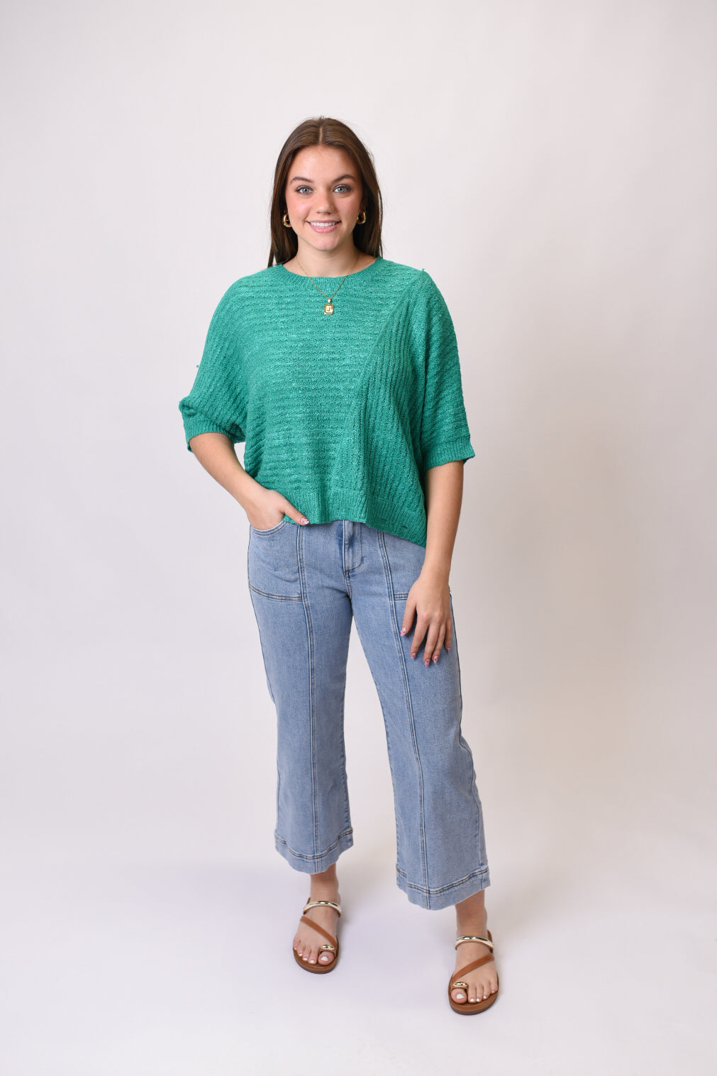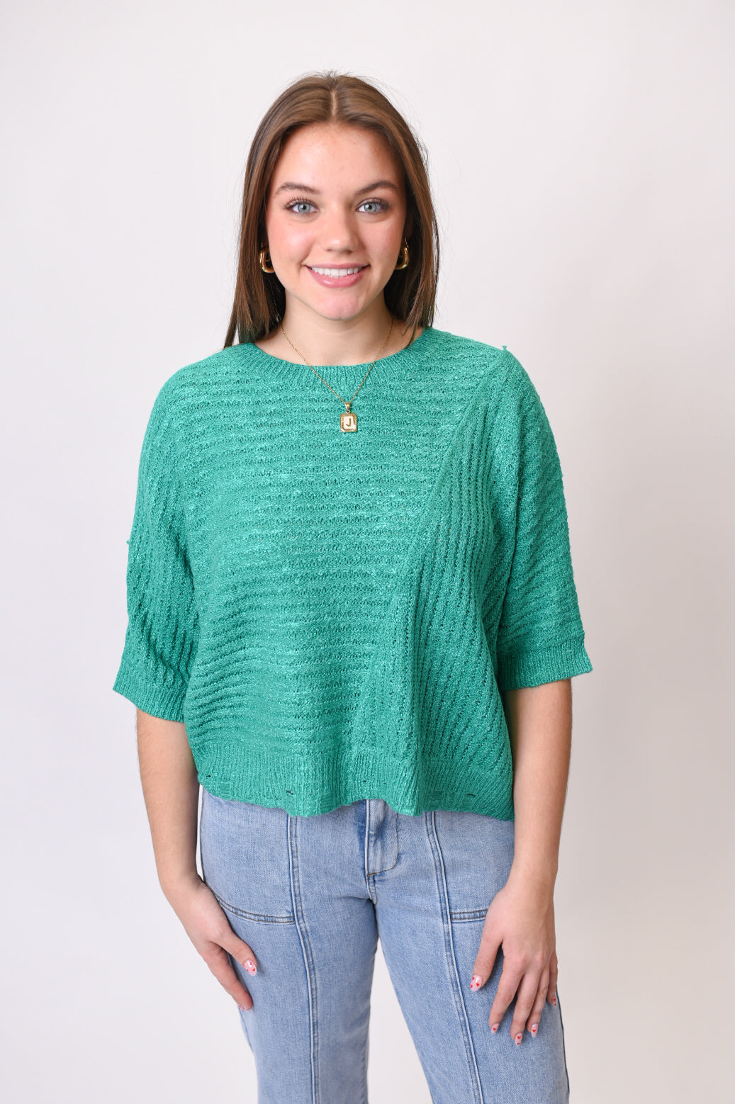 The Lucky Charm Knit Top in Green brings dimensional texture and relaxed sophistication to your everyday wardrobe. Crafted from 100% cotton with mixed ribbed textures, this short-sleeve knit offers a tactile richness that elevates the basics.