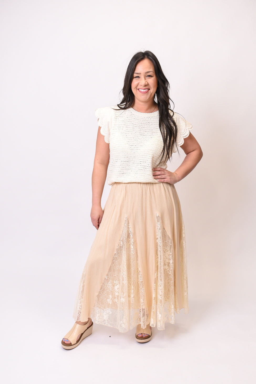 Float through your day in this enchanting mix lace maxi skirt that brings together lightweight texture and delicate floral lace in a beautifully flowing A-line silhouette. Crafted from 100% cotton with a semi-sheer lace overlay, this lined skirt offers the perfect balance of coverage and ethereal charm for those free-spirited moments.