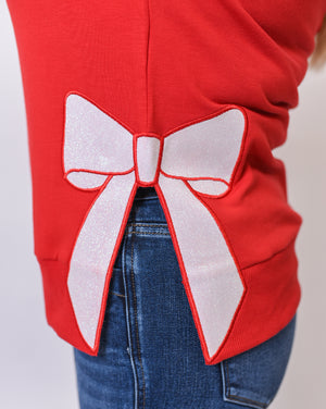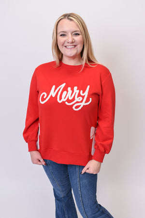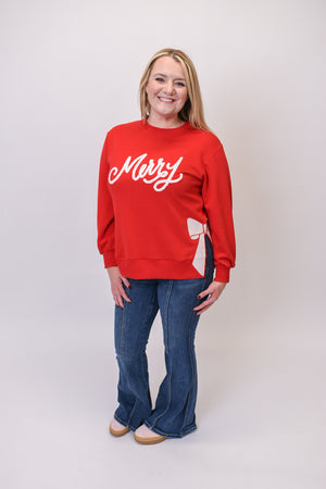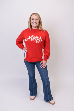 Add a little sparkle to your season with the Merry Magic Pullover — a cheerful twist on a classic sweatshirt. With sequin bow patches, sherpa “Merry” lettering, and soft red fabric, this cozy piece makes every day feel like a holiday celebration.