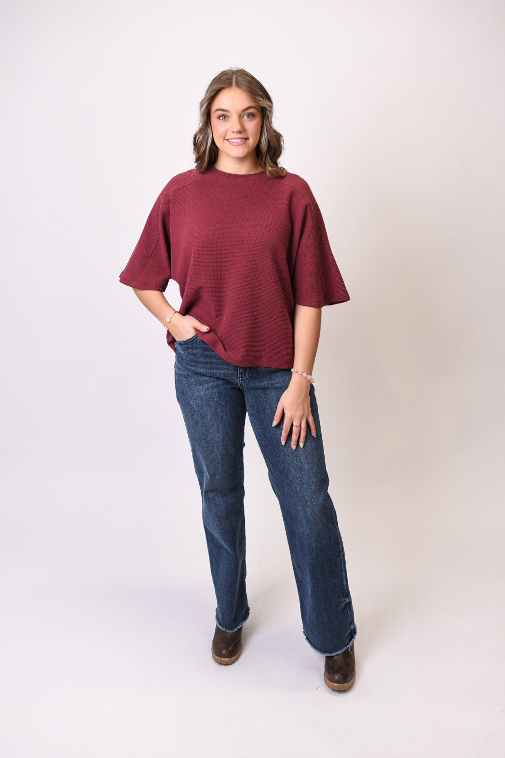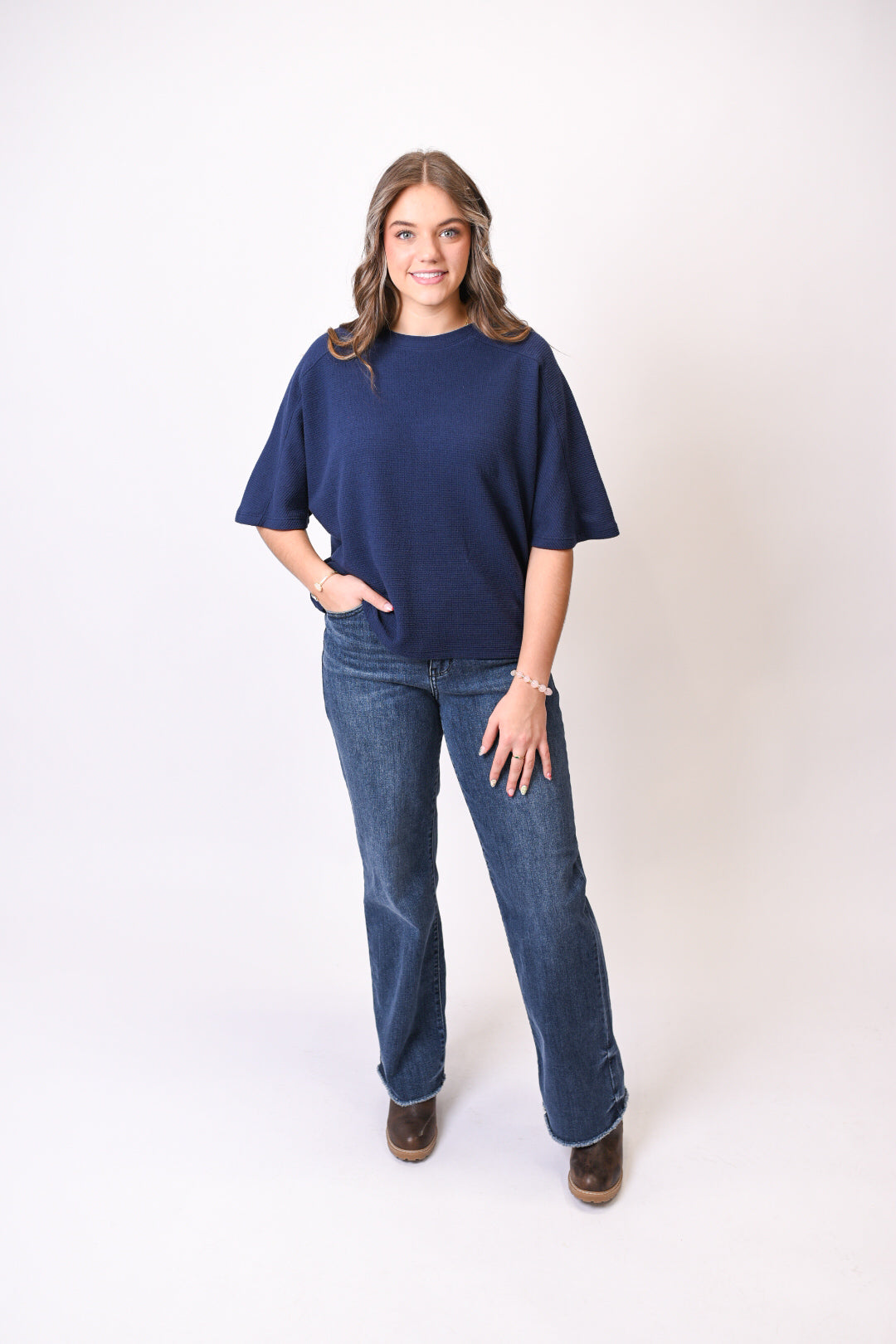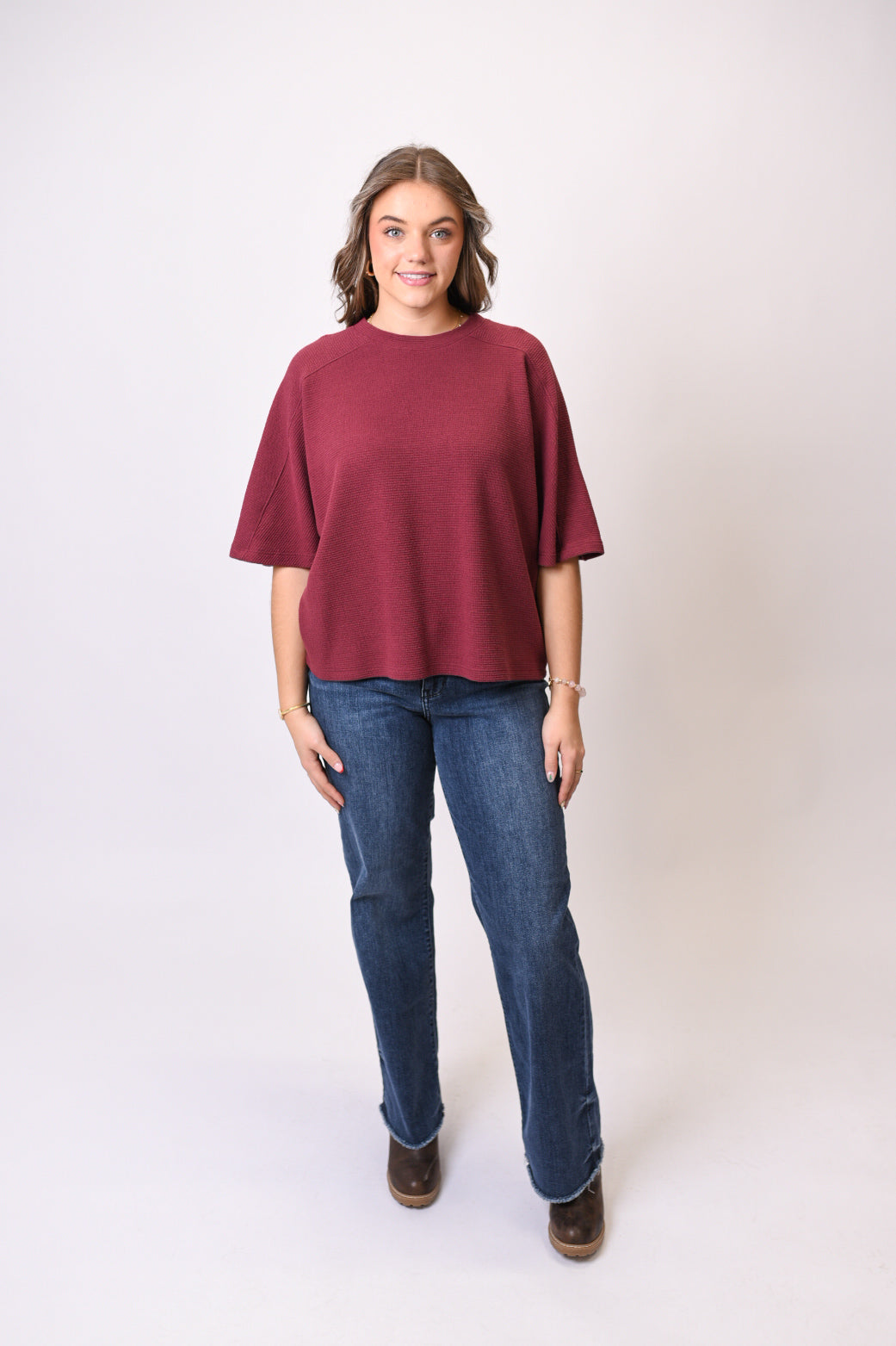 This cloud-knit top is all about relaxed comfort with a polished finish. The softly textured fabric feels cozy against the skin, while the boxy silhouette and dolman sleeves create an effortless, flattering shape. It’s an easy everyday piece you’ll reach for when comfort matters but style still counts.