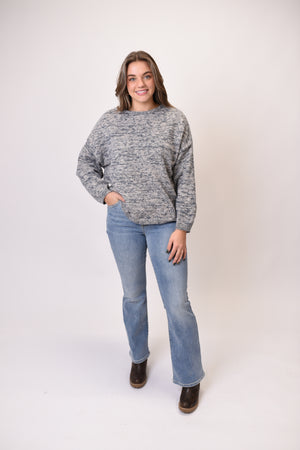 Features: Crew neckline, long sleeves, heathered knit, ribbed hem