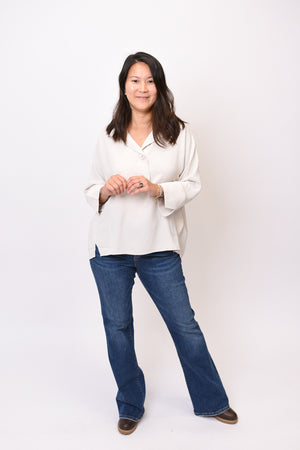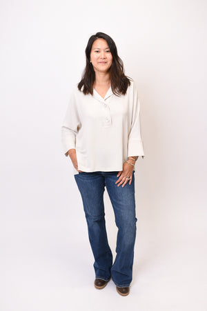 Polished, effortless, and endlessly wearable — this blouse is a true wardrobe staple. Crafted from lightweight, wrinkle-free fabric, it drapes beautifully and moves with you from work to weekend. The soft collar, oversized buttons, and dolman sleeves give it a modern, relaxed sophistication that never goes out of style.