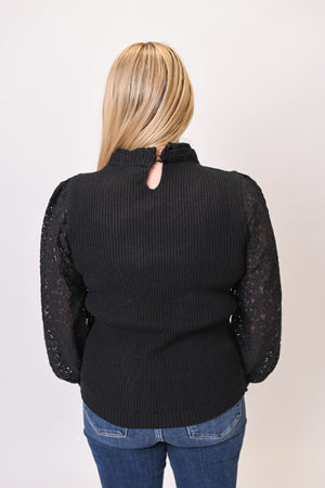 Soft knit meets delicate lace in the Forever After Sweater—a romantic piece that feels effortlessly elegant. The ribbed black knit body offers cozy structure, while floral lace sleeves and neckline details bring a touch of drama.