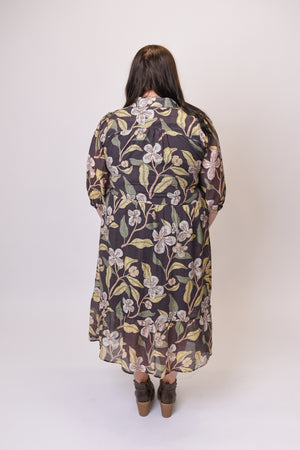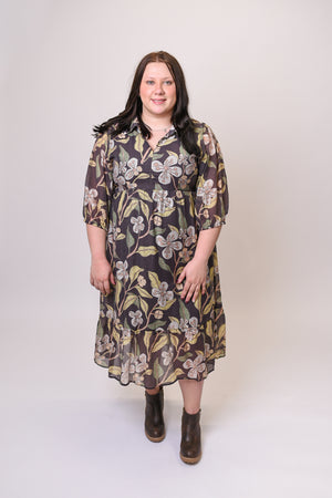 Effortlessly feminine, this midi dress blooms with a relaxed tiered silhouette and soft floral print. Designed with a collared v-neckline and 3/4 sleeves, it’s a flattering piece that moves from day to night with ease.