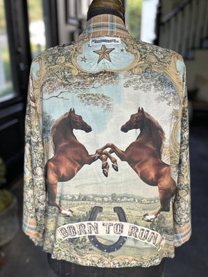 Freedom never looked so artful. The Born To Run Cropped Kimono by Market of Stars blends vintage prints with the wild beauty of George Stubbs’ rearing horses, celebrating adventure and rebellion in every flowing detail. Airy, bold, and timeless, it feels like wrapping yourself in a story of movement and freedom.