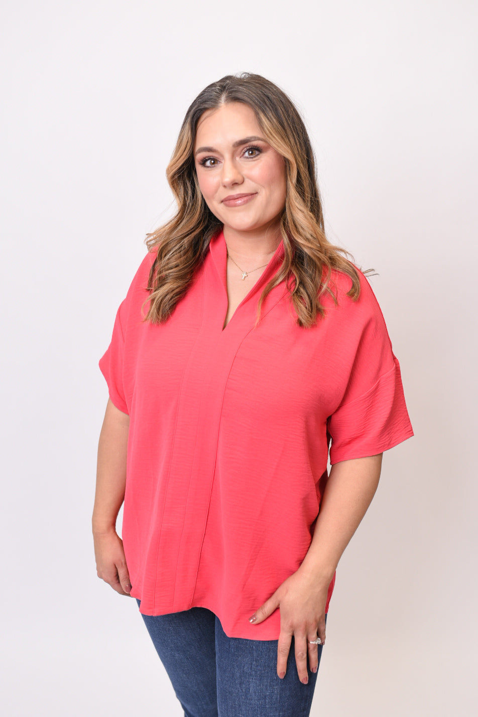 Discover your new go-to blouse with the Breezy Dream Blouse. This lightweight, wrinkle-free top is designed for the woman on the move who refuses to compromise on style. The collared v-neckline creates a flattering frame, while the drop shoulder and short sleeves offer a relaxed, contemporary fit. Crafted from 100% polyester, this blouse stays crisp and polished from morning meetings to evening plans without any fuss.