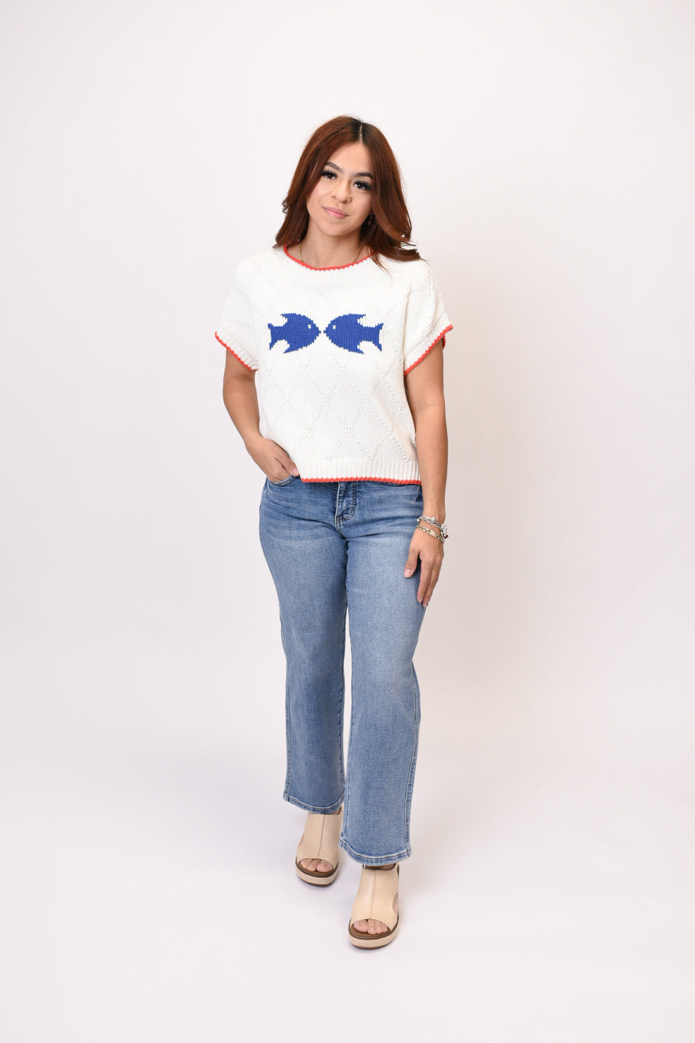 Make a playful statement with this charming marine-inspired sweater top. Featuring whimsical nautical motifs and contrast color edging, this cozy knit brings coastal charm to your everyday wardrobe with relaxed dolman sleeves and a flattering silhouette.