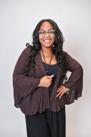 Features: Dyed chestnut fabric, long kimono sleeves, patchwork design with jacquard details, floral threading, frill trim, shrug kimono style