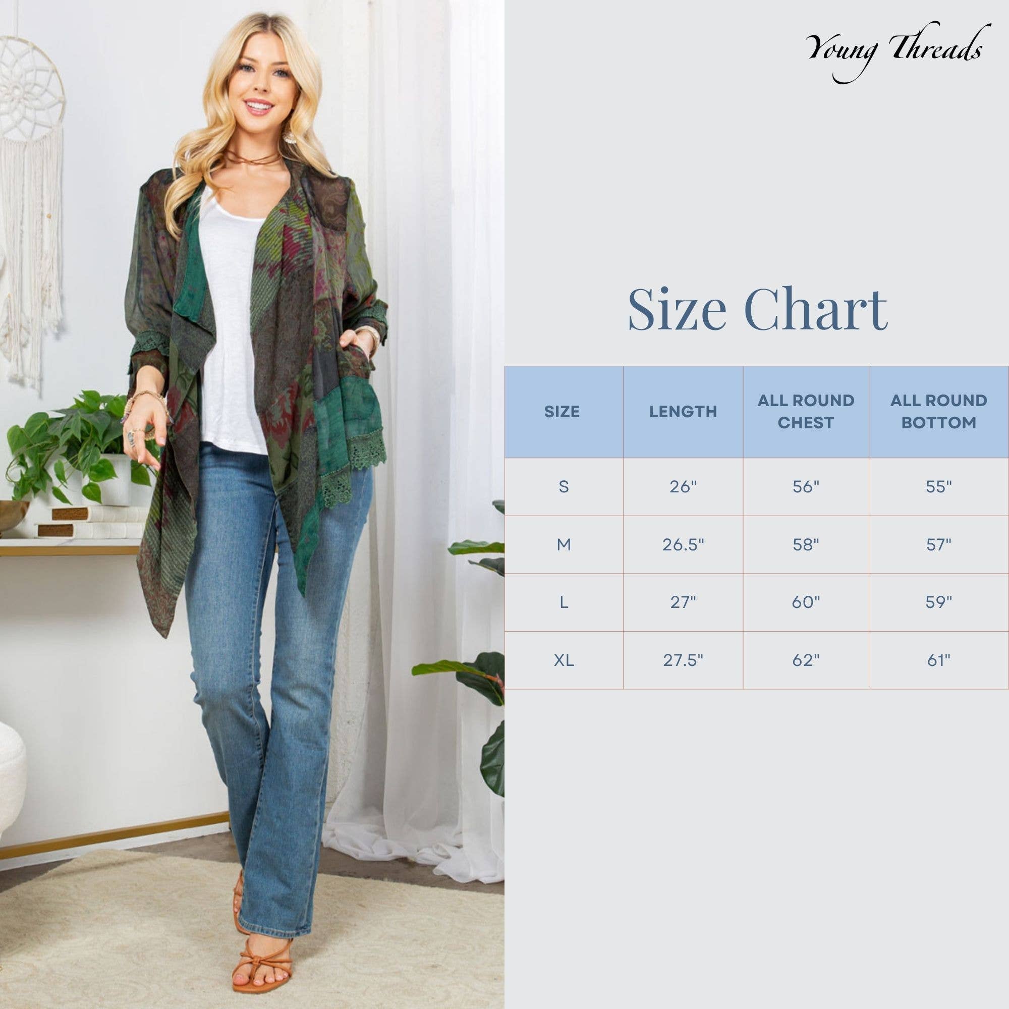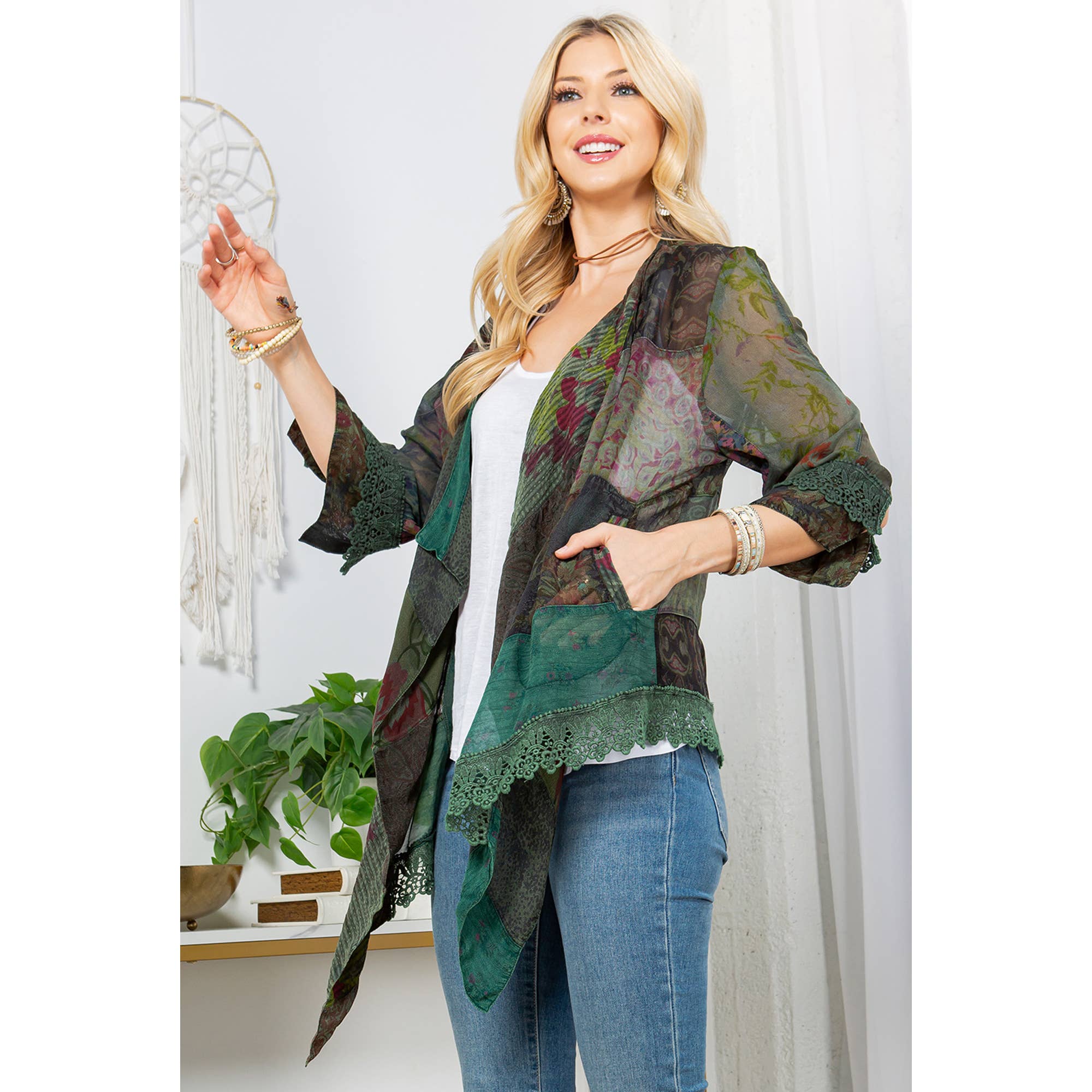 Romantic and free-spirited, this patchwork kimono is finished with delicate lace accents for a touch of elegance. Designed in a soft basil tone with a flowy silhouette, it’s the perfect lightweight layer to bring texture and charm to any outfit.