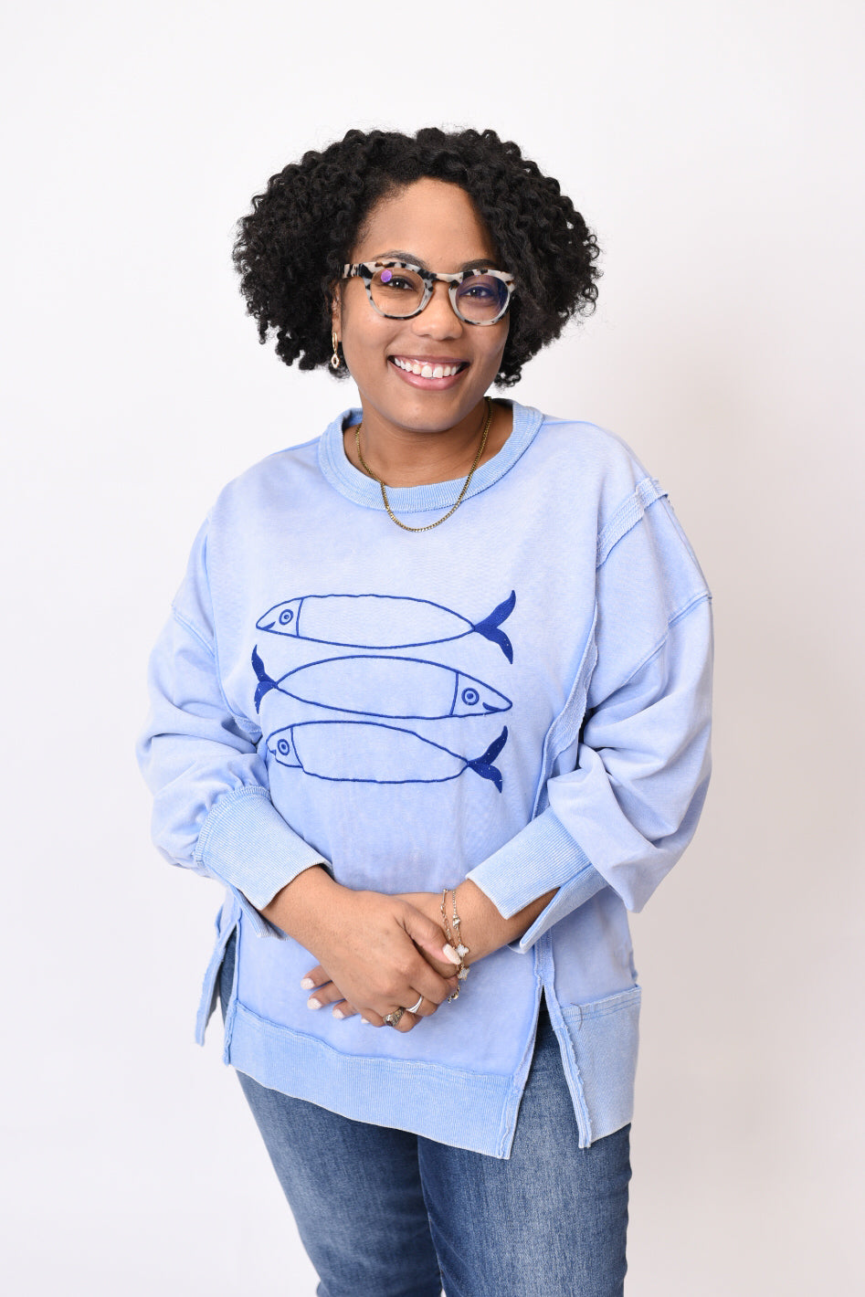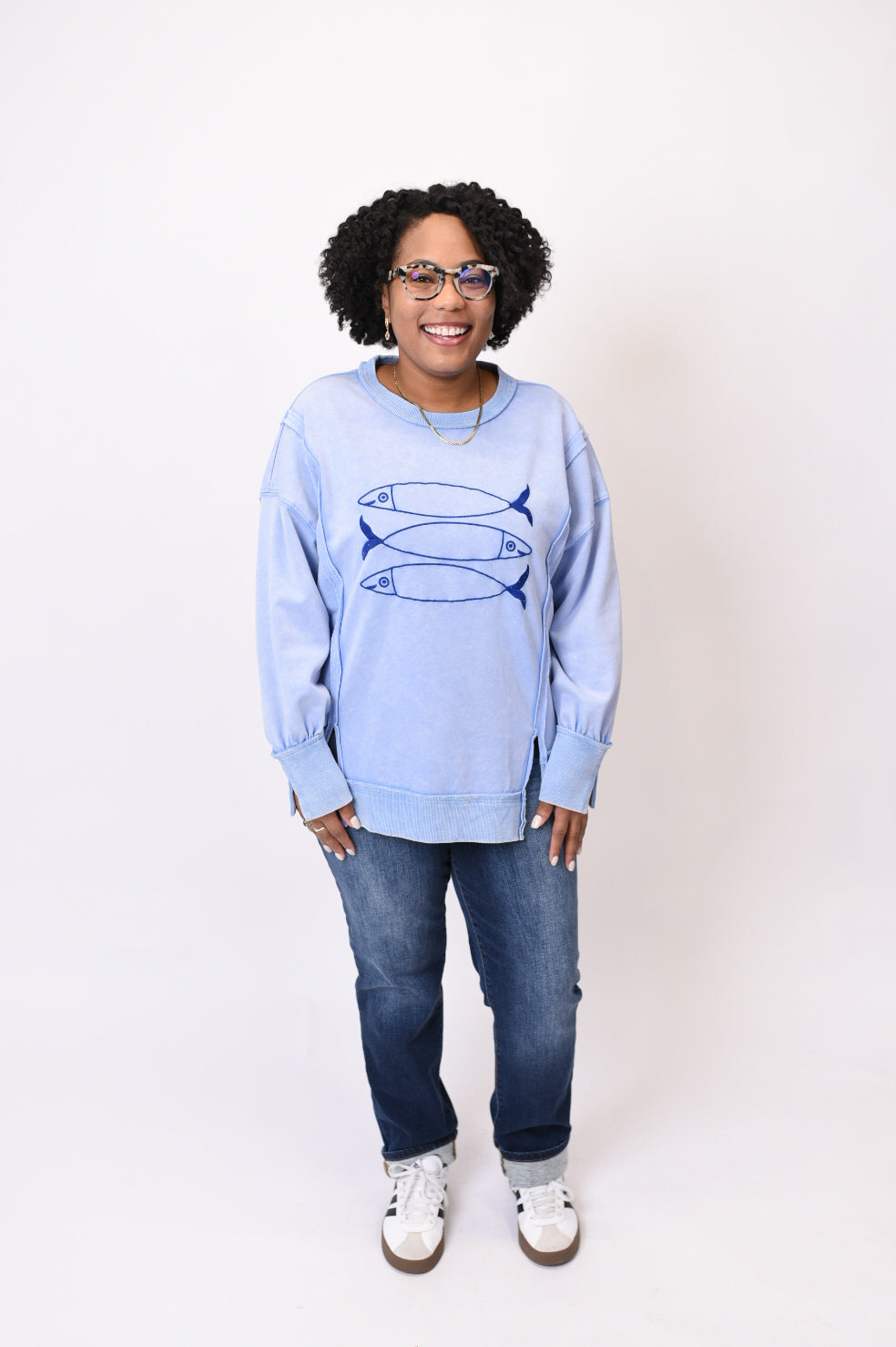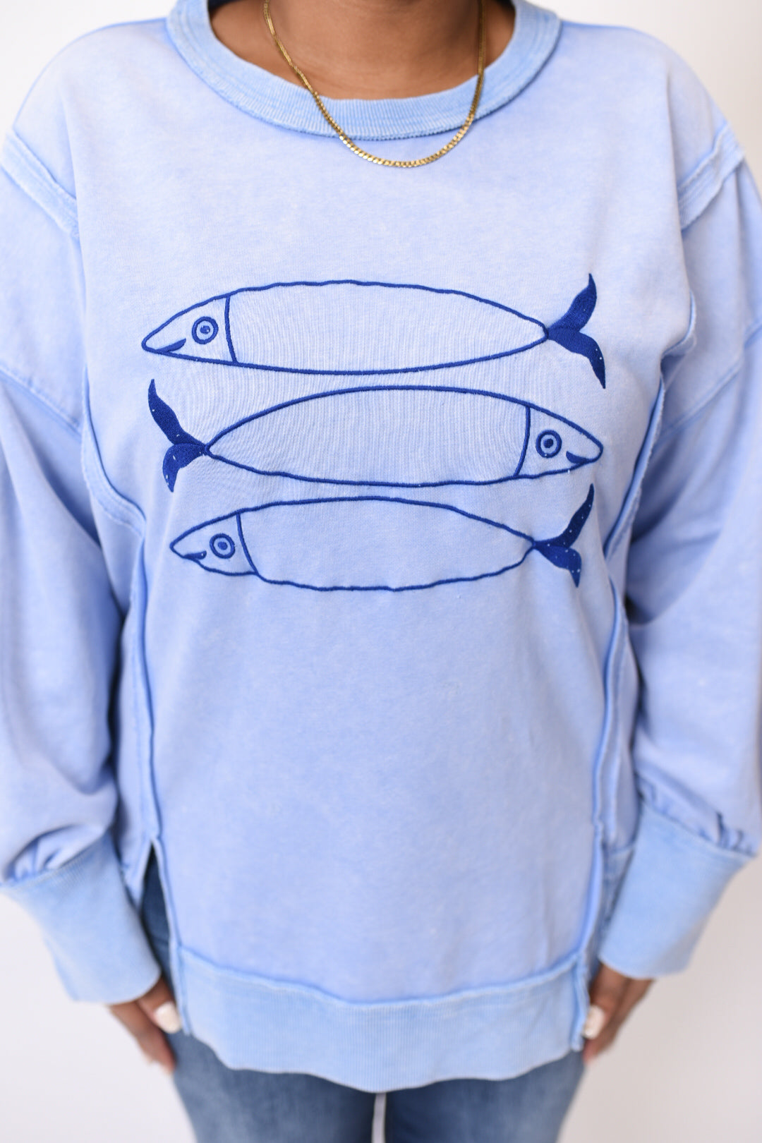 Wrap yourself in the soft, relaxed comfort of our Go Fish Pullover. This charming crewneck features delightful fish embroidery that adds a whimsical touch to your everyday wardrobe. The drop shoulder design and side slits create an effortlessly flattering silhouette that's perfect for layering or wearing solo.