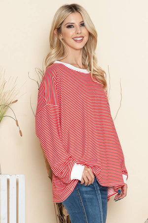 Features: Round neckline, long dolman sleeves, striped pattern, contrast neckline and cuffs, super-soft fabric