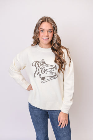 Glide into festive style with this cozy-soft knit featuring a whimsical ice skate graphic. It’s the perfect blend of playful charm and everyday comfort, ready to warm up your winter days.