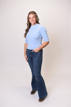A little sparkle goes a long way. This fitted black and periwinkle sweater keeps it classic with a round neckline and ribbed hem, while jewel buttons at the sleeve and collar add just the right amount of shine. Soft, medium-weight, and true to size, it’s an easy way to add polish to your everyday.