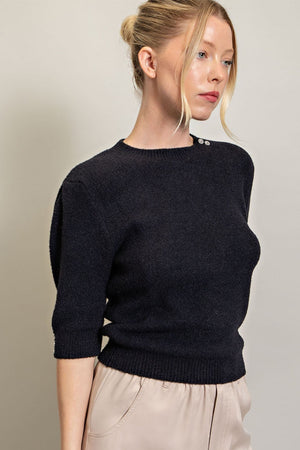 Features: Round neckline, ribbed bottom band, jewel button details, 3/4 sleeves